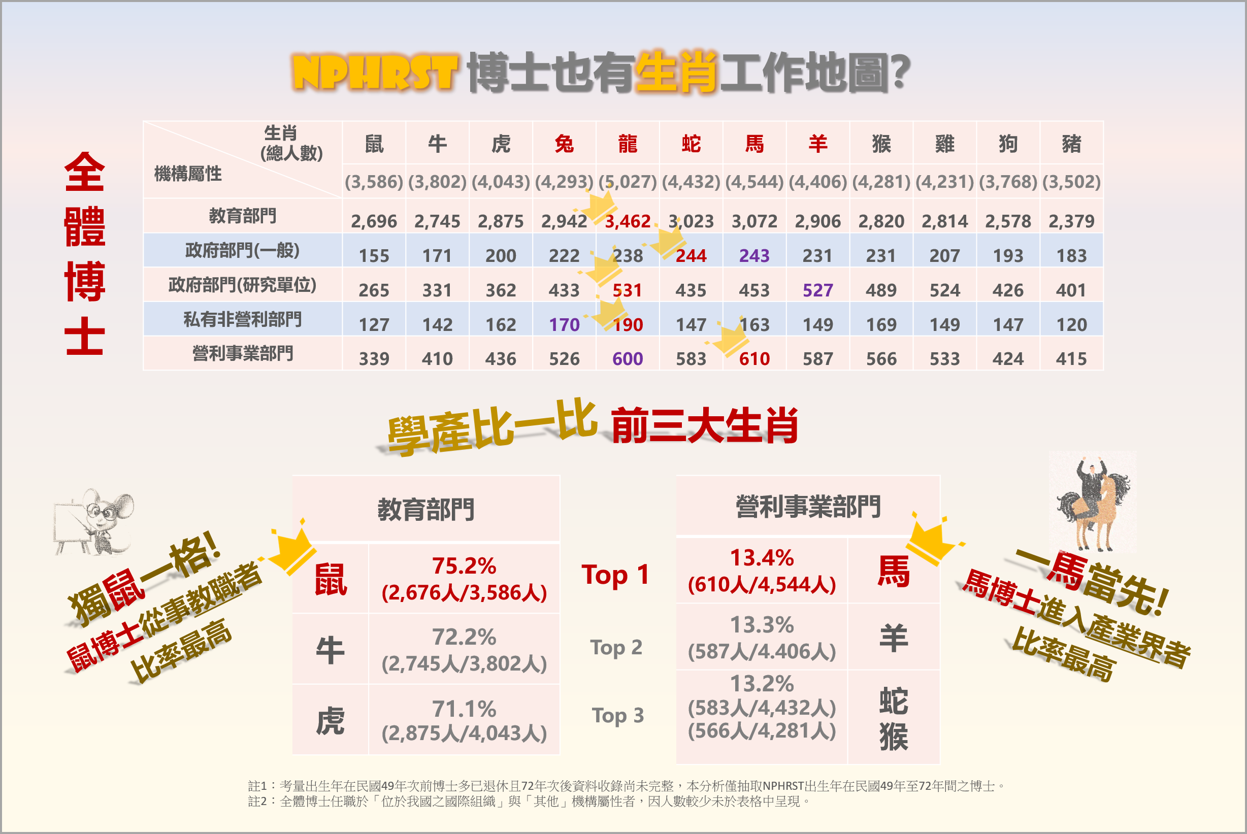 本平台於115年1月9日自NPHRST抽取全體博士『出生年』依「現職工作機構屬性」進行統計,並進一步將機構屬性「教育部門」與「營利事業部門」依生肖占比前三名進行整理。 由下圖可知,就全體博士來看,「教育部門」仍是博士的主要工作去向,其中以龍年人數最高(3,462人),且除龍年、蛇年與馬年的博士人數為三千多人,其他各生肖在「教育部門」服務人數皆為二千多人,至於在其他機構屬性任職者,各生肖相對平均。依各生肖進一步觀察,現職在「教育部門」與「營利事業部門」前三大生肖占比,可發現整體人數相對較少的鼠年、牛年與虎年博士,服務於「教育部門」的占比反而位居前三,產業界則以馬、羊、蛇與猴各約占 13% 左右在該生肖中服務於「營利事業部門」的占比最高。