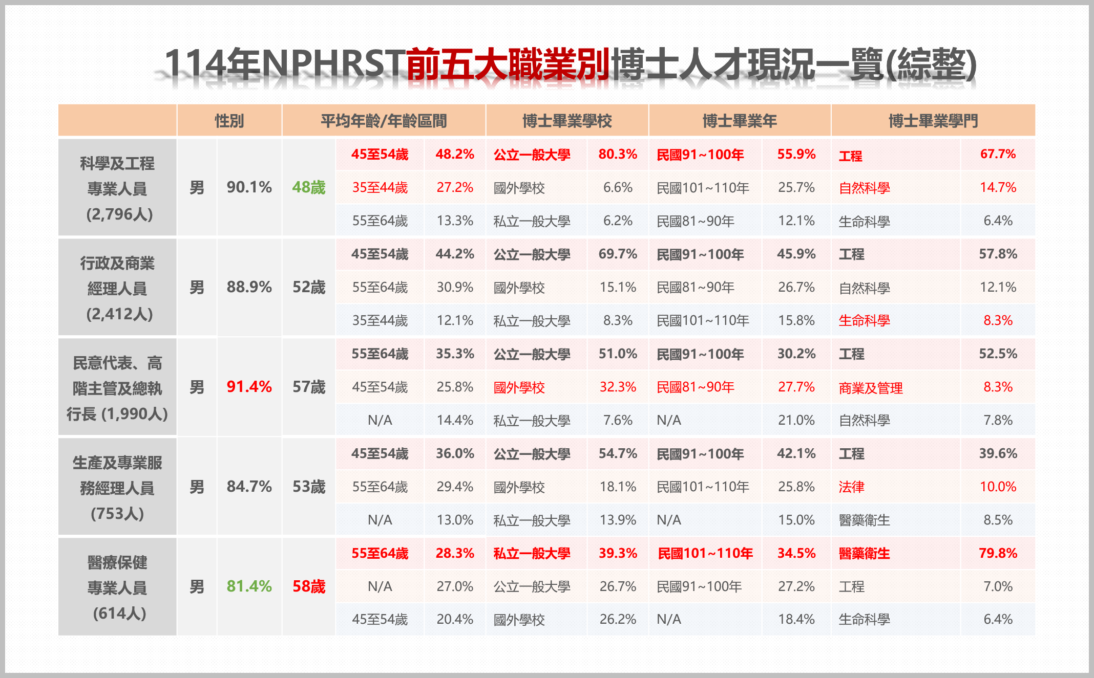 114年NPHRST前五大職業別博士人才現況一覽(綜整)