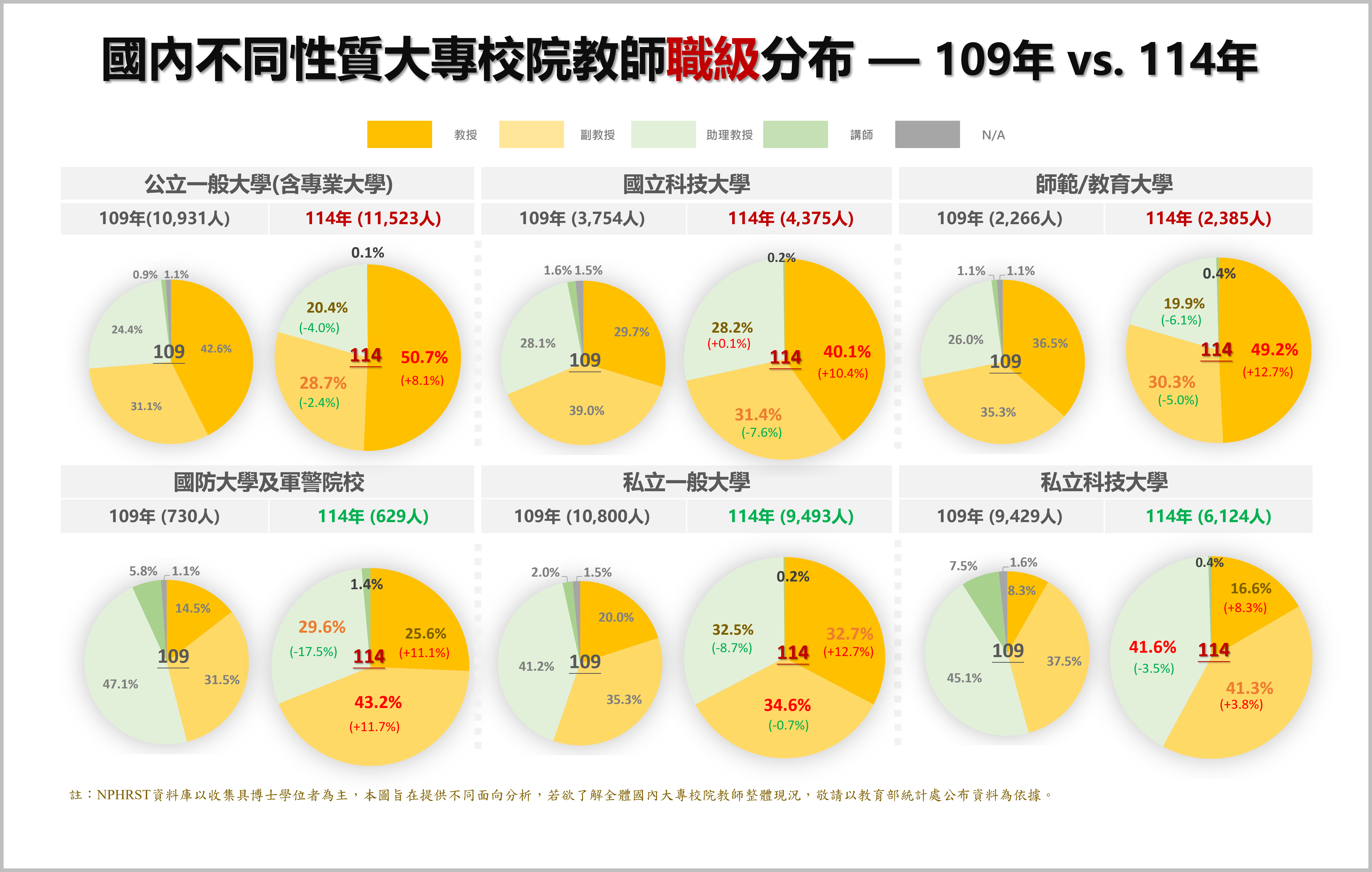 以本平台統計資源網《國內高等教育相關統計-高教師資(雙變項)一大學類別》於114/12/18分別查詢「國立一般大學」、「國立科技大學」、「師範/教育大學」、「國防大學及軍警院校」、「私立一般大學」及「私立科技大學」等六大性質大學院校總計43,962筆具有博士學位的大專教師資料,與本平台於109年12月的輪播《國內不同性質大專校院教師年齡與職級結構分析(II) — 教師職級》進行比較。 各性質大專校院之「教授」職級占比均呈現成長趨勢 ,其中以「公立一般大學(含專業大學)」及「師範/教育大學」114年的「教授」占比最為顯著,分別達 50.7%及49.2%。相較之下,「私立一般大學」與「私立科技大學」的「教授」占比雖較前述學校性質大學低約一至三成 ,但成長幅度亦相當明顯,「私立一般大學」教授占比達32.7%,而「私立科技大學」則由8.3%翻倍成長至 16.6%;另,「私立科技大學」的「助理教授」占比雖微幅由45.1%下降至 41.6%,但仍是該校類別中占比最高的職級,顯示「私立科技大學」仍以「助理教授」為主要的教學支柱。 若從教師職級消長趨勢觀察,「公立一般大學(含專業大學)」、「國立科技大學」及「師範/教育大學」之「副教授」占比均普遍下滑,尤以「國立科技大學」由39.0%降至31.4%最為顯著 ,「師範/教育大學」亦從35.3%降至30.3%,顯示中堅職級師資持續向高階「教授」職級推移;相對而言,「國防大學及軍警院校」之「副教授」占比從31.5%激增至43.2%,「助理教授」由 47.1%驟減至29.6%,亦顯示了由初階職級往中階職級移動的結構性變化。整體而言,各類院校在面對員額凍結或縮編時,由於資深師資的持續晉升,使得校園職級結構呈現明顯的「上移」現象,新進人力在公立體系的占比受壓縮,而私立體系則因總人數銳減面臨更艱鉅的傳承壓力。